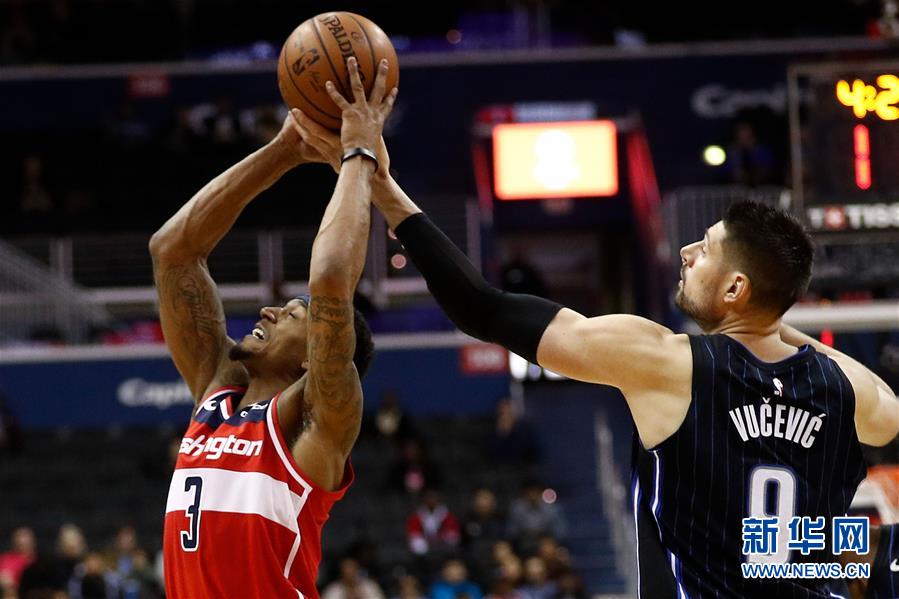 奇才队球员比尔(左)在比赛中与魔术队球员乌切维奇抢球。新华社发(沈霆摄)