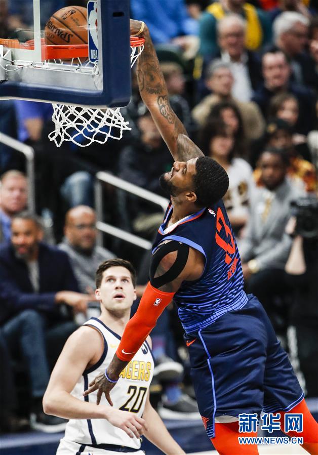 3月14日,雷霆队球员乔治(右)在比赛中扣篮。 当日,在2018-2019赛季NBA常规赛中,印第安纳步行者队主场以108比106战胜俄克拉荷马雷霆队。 新华社发