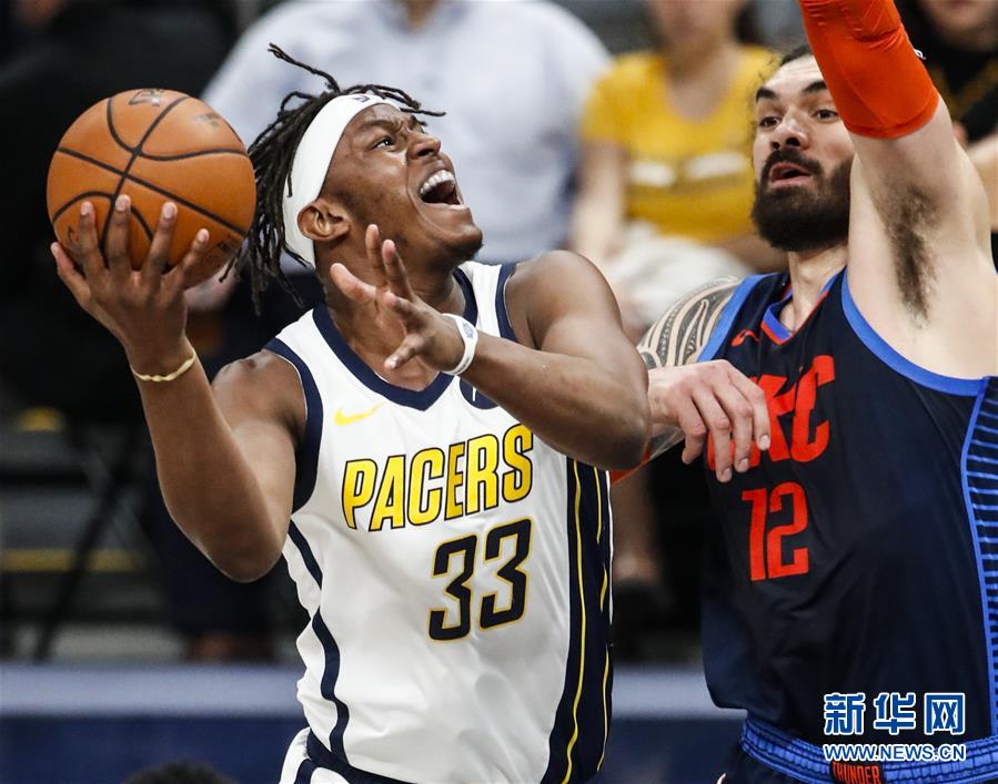 步行者队球员特纳(左)在比赛中上篮。新华社发