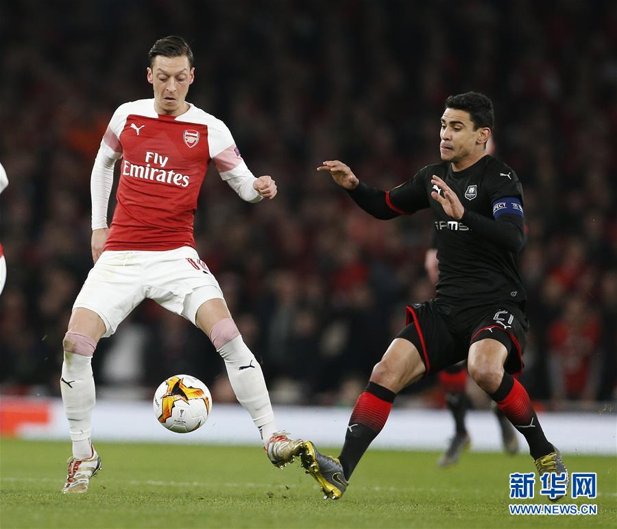 3月14日,阿森纳队球员厄齐尔(左)与雷恩队球员安德烈拼抢。 当日,在英国伦敦进行的欧罗巴联赛八分之一决赛第二回合比赛中,英超阿森纳队主场以3比0战胜法甲雷恩队,以两回合4比3的总比分晋级。 新华社发