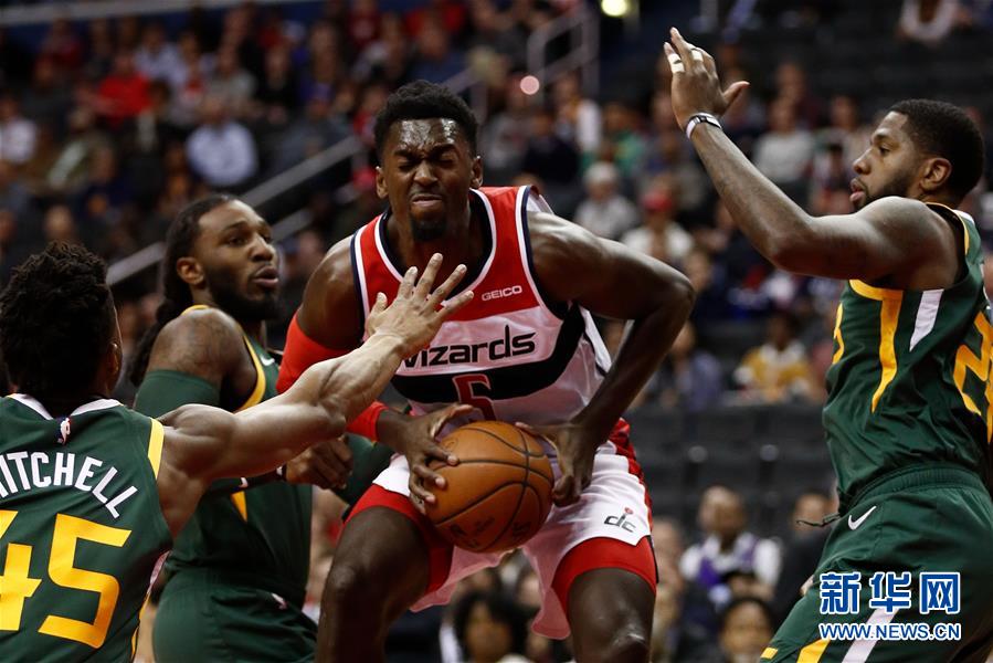 3月18日,奇才队球员波蒂斯(中)在比赛中运球突破。 当日,在2018-2019赛季NBA常规赛中,华盛顿奇才队主场以95比116不敌犹他爵士队。 新华社发(沈霆摄)