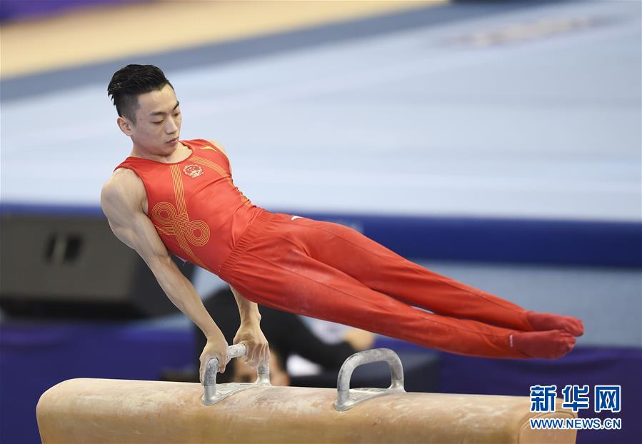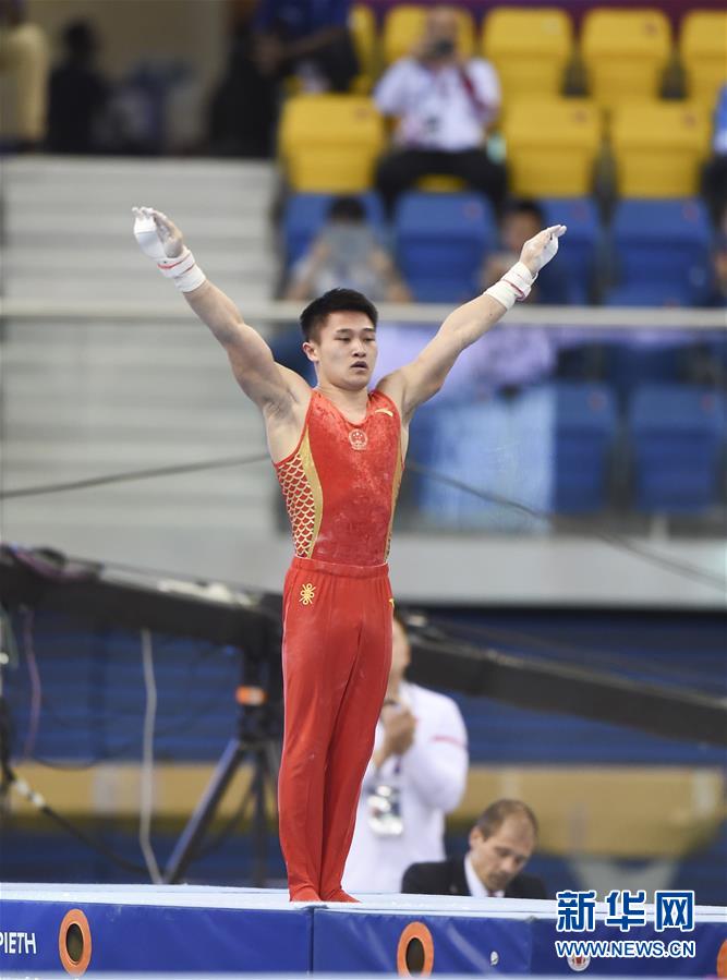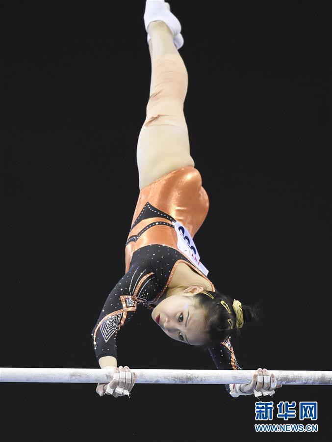 3月20日,范忆琳在预赛中。 当日,在多哈进行的国际体操联合会世界杯卡塔尔站女子高低杠预赛中,中国选手范忆琳以14.900分的成绩位列第二。 新华社发(尼库摄)