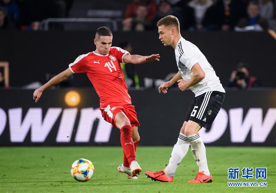 3月20日,德国队球员基米希(右)在塞尔维亚队球员加契诺维奇的防守下传球。 当日,在德国沃尔夫斯堡进行的一场国际足球友谊赛中,德国队主场以1比1战平塞尔维亚队。 新华社发