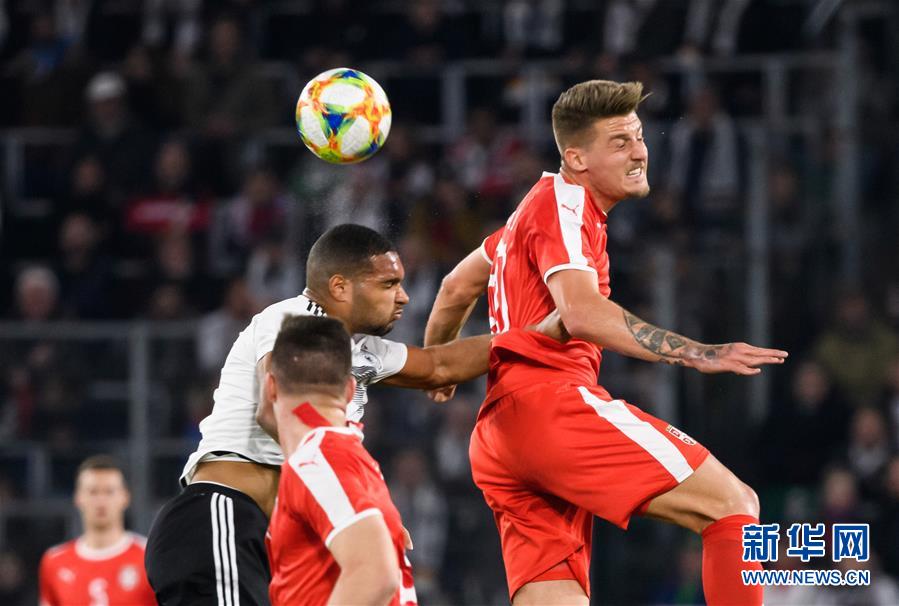 塞尔维亚队球员米林科维奇-萨维奇(上右)与德国队球员乔纳森·塔(上左)在比赛中争顶。新华社发