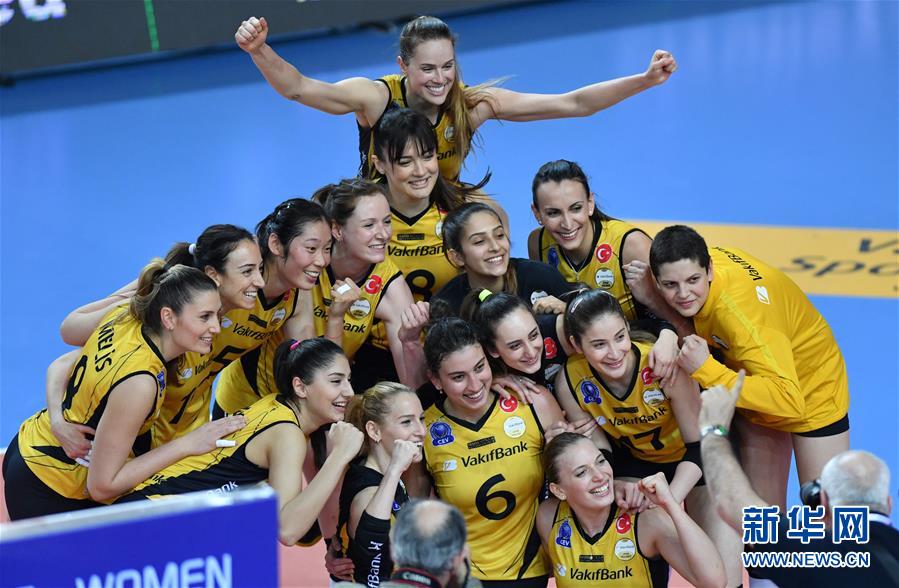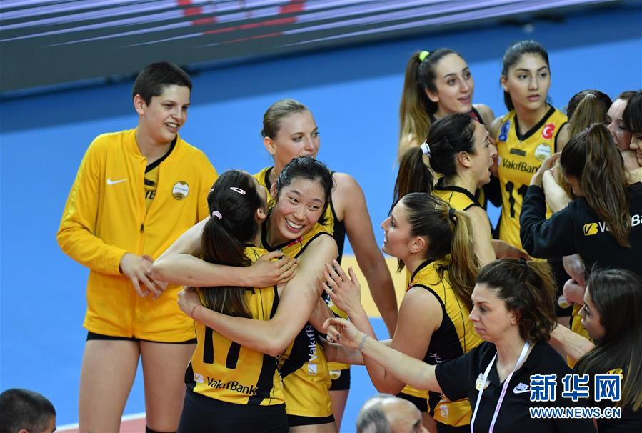 3月20日,瓦基弗银行队球员朱婷(下左二)和队友们庆祝晋级。 当日,在2019欧洲女子排球冠军联赛四分之一决赛第二回合比赛中,中国球员朱婷效力的土耳其瓦基弗银行队主场以3比0战胜俄罗斯莫斯科迪纳摩队,双方两回合各胜一场,瓦基弗银行队以积分的优势晋级四强。 新华社记者徐速绘摄