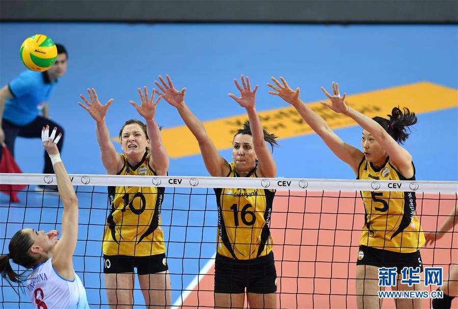 瓦基弗银行队球员朱婷(右一)在比赛中拦网。新华社记者徐速绘摄