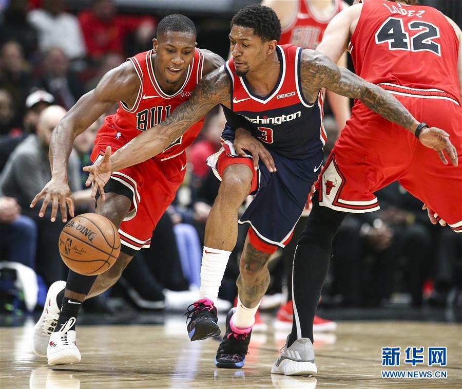 公牛队球员邓恩(左)与奇才队球员比尔在比赛中拼抢。新华社发