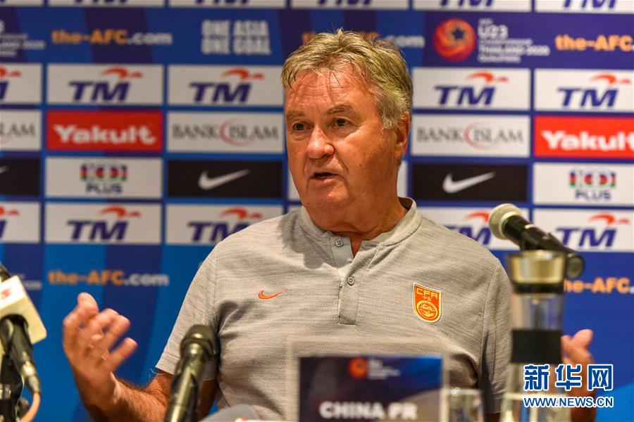 中国国奥队主教练希丁克在新闻发布会上发言。新华社发(张纹综摄)