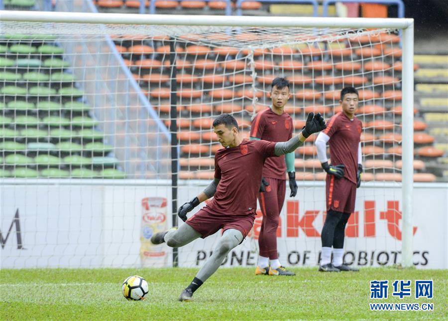 中国国奥队守门员库迪热提(前)在赛前训练中。新华社发(张纹综摄)