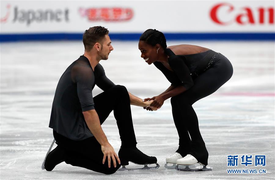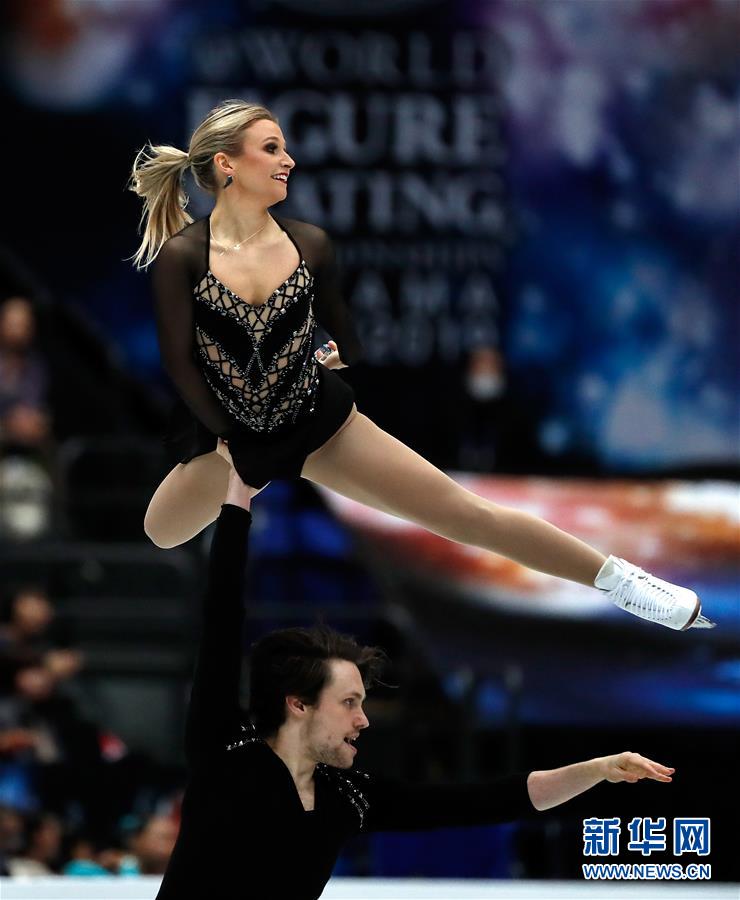 3月21日,詹姆斯(右)/西普雷斯在双人滑自由滑比赛后庆祝。当日,法国组合瓦内萨·詹姆斯/摩根·西普雷斯在日本埼玉举行的2019年花样滑冰世界锦标赛双人滑比赛中,以215.19分的总成绩获得第五名。 新华社记者王丽莉摄