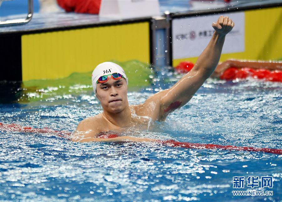3月24日,孙杨在男子400米自由泳决赛后庆祝。 当日,在山东青岛举行的2019年全国游泳冠军赛暨世锦赛选拔赛男子400米自由泳决赛中,浙江队选手孙杨以3分43秒73的成绩夺得冠军。 新华社记者李紫恒摄