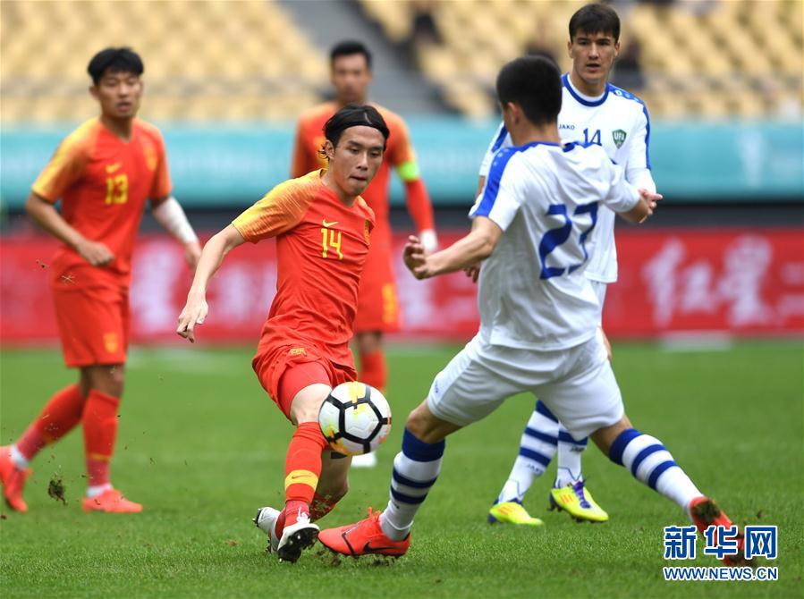 3月25日,中国队球员张修维(中)在比赛中拼抢。 当日,在广西南宁举行的2019年中国杯国际足球锦标赛季军争夺战中,中国国家男子足球集训队以0比1不敌乌兹别克斯坦队。 新华社记者周华摄