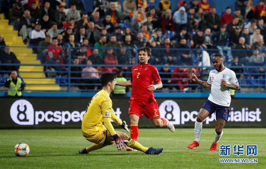 3月25日,英格兰队球员斯特林(右)射门得分。 当日,在黑山波德戈里察举行的2020年欧洲足球锦标赛预选赛A组第二轮比赛中,英格兰队客场以5比1战胜黑山队。 新华社/路透