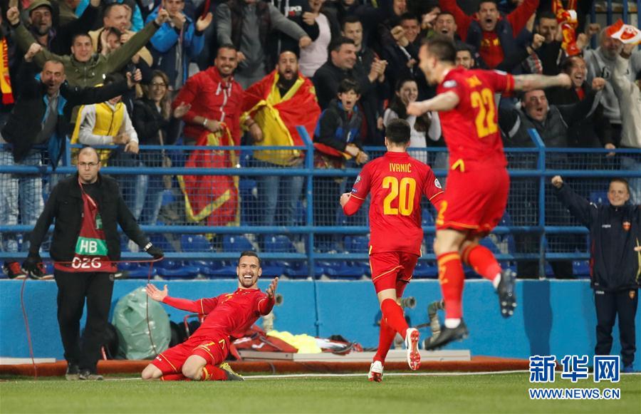 3月25日,黑山队球员维索维奇(前左)庆祝进球。 当日,在黑山波德戈里察举行的2020年欧洲足球锦标赛预选赛A组第二轮比赛中,英格兰队客场以5比1战胜黑山队。 新华社/路透
