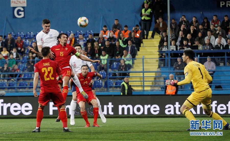 3月25日,英格兰队球员基恩(上)打入本队第一粒进球。 当日,在黑山波德戈里察举行的2020年欧洲足球锦标赛预选赛A组第二轮比赛中,英格兰队客场以5比1战胜黑山队。 新华社/路透
