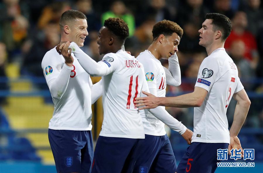 3月25日,英格兰队球员巴克利(左一)和队友庆祝进球。 当日,在黑山波德戈里察举行的2020年欧洲足球锦标赛预选赛A组第二轮比赛中,英格兰队客场以5比1战胜黑山队。 新华社/路透