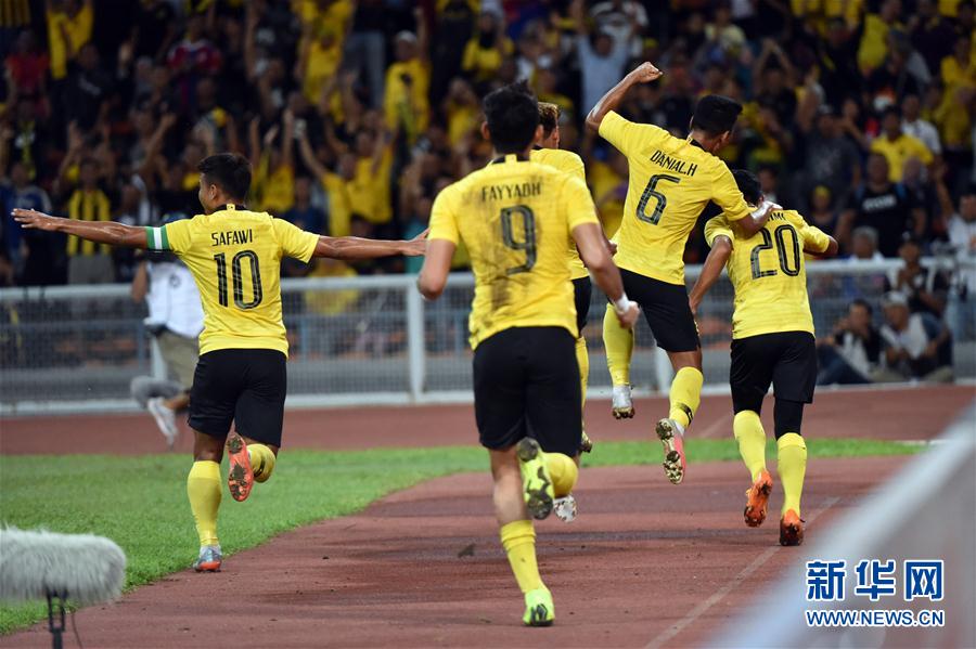 3月26日,马来西亚国奥队球员萨法里(右一)进球后与队友庆祝。 当日,在马来西亚沙阿兰体育场举行的2020年U23亚锦赛预选赛暨东京奥运会第一阶段预选赛东亚区J组第三轮比赛中,中国国奥队以2比2战平马来西亚国奥队,晋级U23亚锦赛正赛。 新华社记者朱炜摄