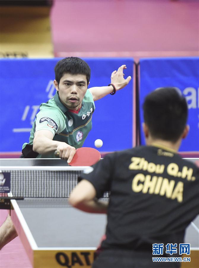 3月27日,中国台北选手庄智渊(左)与中国选手周启豪在比赛中。 当日,在2019年国际乒联世界巡回赛卡塔尔公开赛男子单打预赛第四轮比赛中,中国台北选手庄智渊以3比4不敌中国选手周启豪,无缘正赛。 新华社发(尼库摄)
