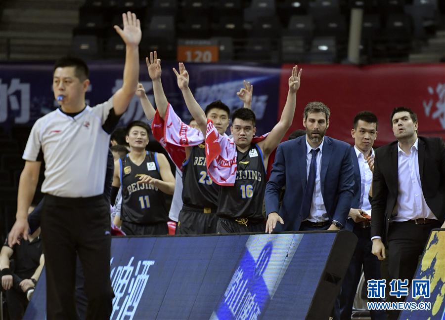 3月27日,北京首钢队球员在比赛中庆祝得分。 当日,在2018-2019赛季中国男子篮球职业联赛(CBA)季后赛四分之一决赛第二回合比赛中,深圳马可波罗队主场以88比104不敌北京首钢队。 新华社发(储焱摄)