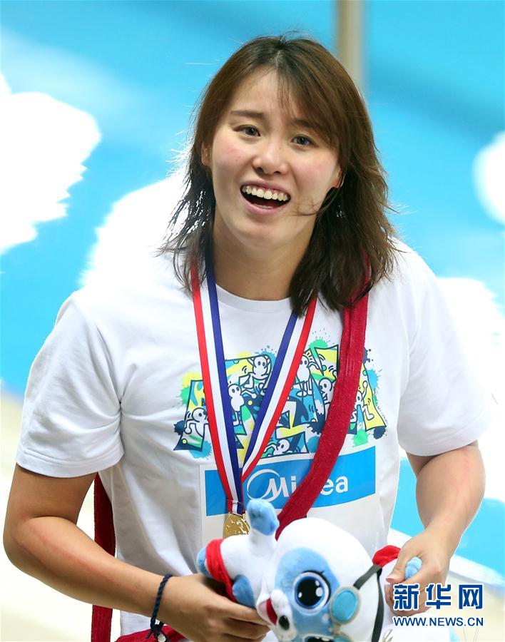 3月28日,傅园慧在颁奖仪式后。 当日,在青岛举行的2019全国游泳冠军赛暨世锦赛选拔赛女子50米仰泳决赛中,浙江队选手傅园慧以27秒61的成绩获得冠军。 新华社发(雒圆摄)