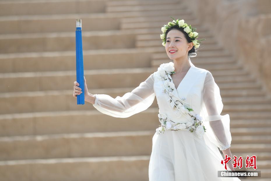 3月28日,第二届全国青年运动会圣火在山西省运城市芮城县西侯度遗址圣火公园成功采集,二青会火炬传递序幕同时拉开。图为圣火少女、中国艺术体操运动员张豆豆。 中新社记者 武俊杰 摄