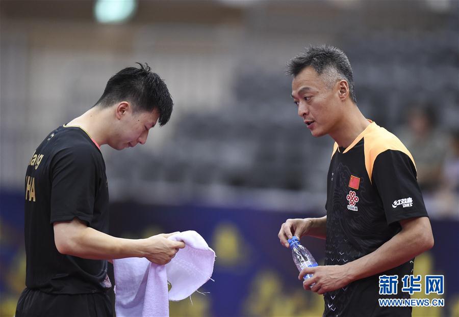 3月28日,中国选手马龙(左)在比赛中接受教练秦志戬的指导。 当日,在2019年国际乒联世界巡回赛卡塔尔公开赛男子单打首轮比赛中,中国选手马龙以4比2战胜法国选手弗洛尔,晋级下一轮。 新华社发(尼库摄)