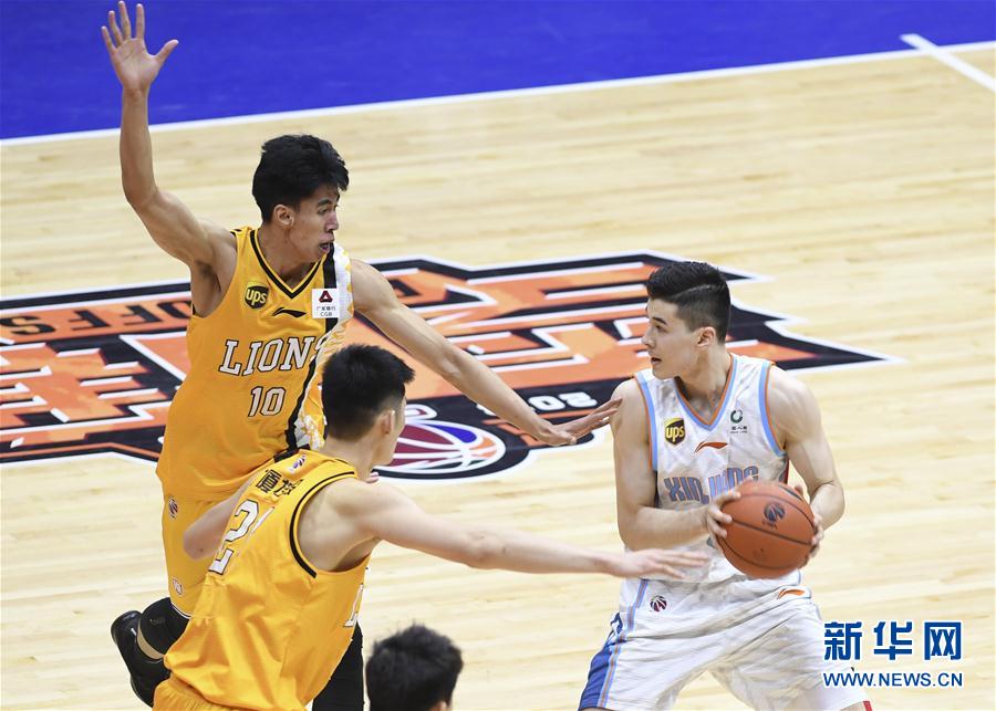 3月26日,新疆广汇汽车队球员阿不都沙拉木(右)在比赛中伺机传球。 当日,在2018-2019赛季中国男子篮球职业联赛(CBA)季后赛四分之一决赛首回合比赛中,新疆广汇汽车队主场以134比100战胜浙江广厦控股队。 新华社记者胡虎虎摄
