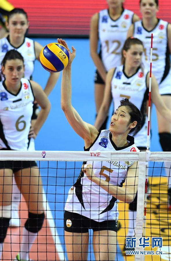 3月28日,瓦基弗银行队球员朱婷(前)在场上热身。 当日,在2018-2019赛季土耳其女排超级联赛四分之一决赛第二回合比赛中,瓦基弗银行队主场以3比0战胜尼吕费尔队,并以主客场皆胜的成绩晋级四强。 新华社记者徐速绘摄