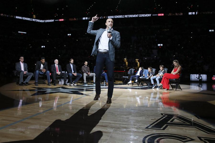 3月28日,吉诺比利在球衣退役仪式上讲话。 当日,在2018-2019赛季NBA常规赛,圣安东尼奥马刺队主场迎战克利夫兰骑士队的比赛后,马刺队为前队员吉诺比利举行球衣退役仪式。 新华社/路透