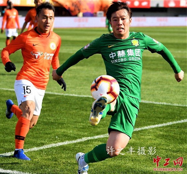 2019年3月30日下午,中超联赛第3轮比赛上演京城德比战,北京中赫国安客场以1比0战胜北京人和,国安取得3连胜,人和遭遇3连败。比赛第39分钟,比埃拉为国安赢得点球,但于大宝主罚被人和门将张烈扑住。第61分钟,国安队李磊左路传中,于大宝将功补过头球破门。图为双方的比赛瞬间。工人日报-中工网许之丰摄影报道