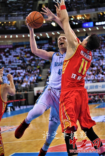 2019年3月30日晚,CBA季后赛,北京主场面对来访的深圳队,已经拿到赛点的北京首钢队没能遏制住深圳的反扑,最终以110比116负于深圳,深圳队扳回一局,总比分北京2比1领先。图为双方的比赛瞬间。比赛双方数据:北京队杰克逊27分5篮板9助攻,汉密尔顿25分,方硕22分6助攻,翟晓川11分10篮板。深圳队拜克斯35分5篮板,卢艺文21分8篮板,李慕豪14分9篮板。工人日报-中工网许之丰摄影报道