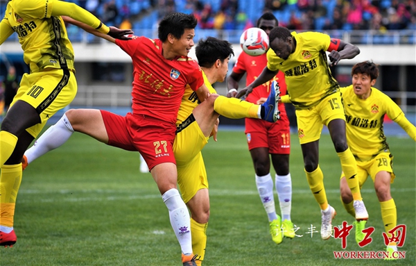 2019年3月31日,北京奥林匹克体育场,中甲联赛第3轮比赛,北京北体大队主场对阵呼和浩特队。上半场呼和浩特队由张天翔射门得分,随后外援桑格尔门前头球再入一球。下半场北京北体大队虽然加强了攻势,但仍然没能破门,最终北京北体大队主场0比2告负。比赛结束后北体大队主教练高洪波说“在我二十多年的执教生涯中,联赛开始前三轮球队不能取得进球,应该说是第一次。”图为双方的比赛。工人日报-中工网许之丰摄影报道
