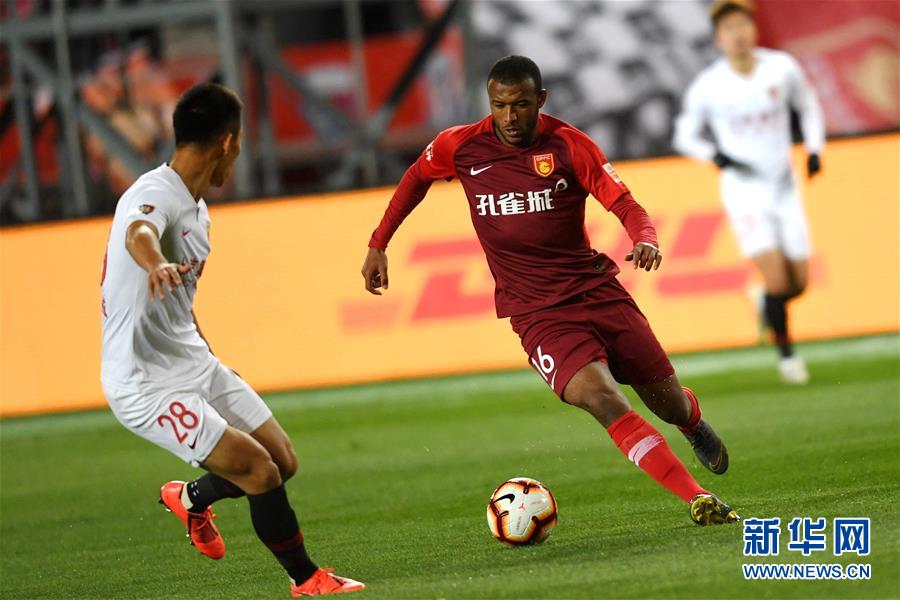 3月30日,河北华夏幸福队球员卡埃比(右)在比赛中带球。 当日,在2019赛季中超联赛第三轮比赛中,河北华夏幸福队主场以1比2不敌上海上港队。 新华社记者王晓摄