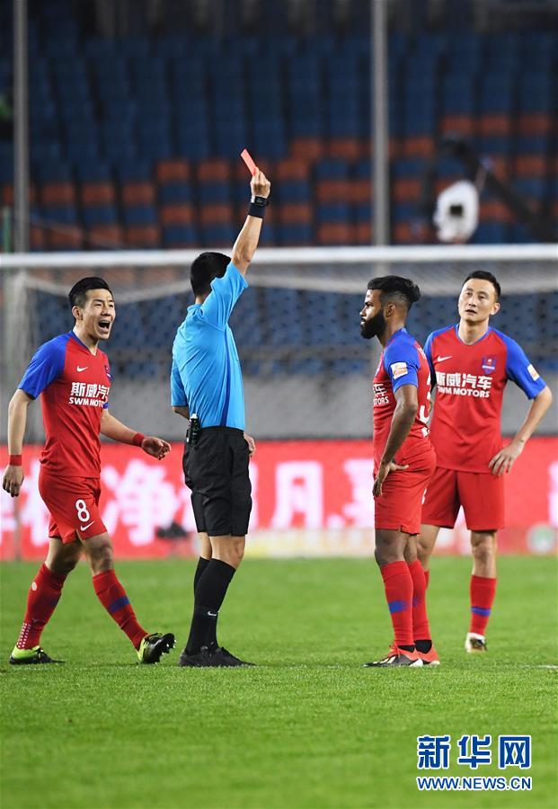 重庆斯威队球员费尔南迪尼奥(右二)被出示红牌。新华社记者王全超摄