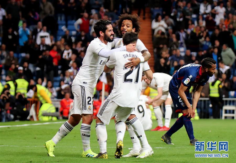 3月31日,皇家马德里队球员伊斯科(左一)、马塞洛(左二)和布拉依姆·迪亚兹(左三)在比赛中庆祝本队进球。 当日,在2018-2019赛季西班牙足球甲级联赛第29轮比赛中,皇家马德里队主场以3比2战胜韦斯卡队。 新华社发