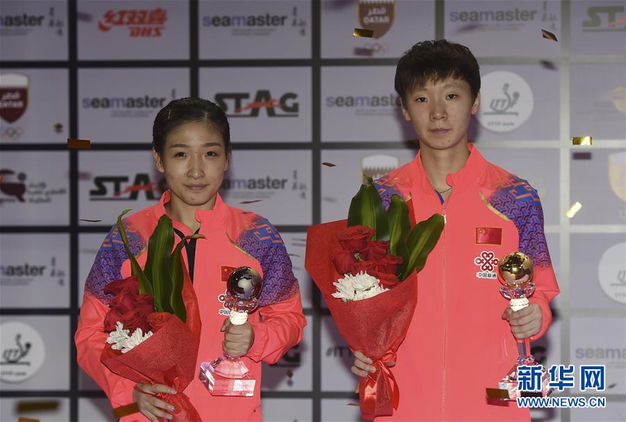 3月31日,王曼昱(右)和刘诗雯在颁奖台上合影。 当日,在2019年国际乒联世界巡回赛卡塔尔公开赛女单决赛中,中国选手王曼昱以4比2战胜队友刘诗雯,夺得冠军。 新华社发