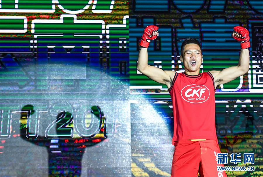 3月30日,在男子65公斤级决赛中,杨福冲赛前出场时与观众欢呼互动。 当日,由中视体育和CKF功夫联盟联合主办的ATT2019CKF西南公开赛在云南曲靖决出60、65、70公斤级冠军。 新华社记者刘大伟摄