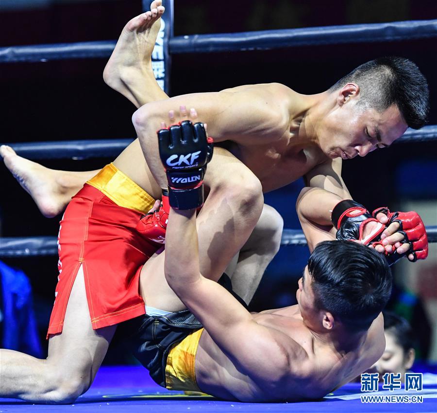 在男子65公斤级决赛中,杨福冲(上)战胜吉木五沙,获得冠军。新华社记者刘大伟摄