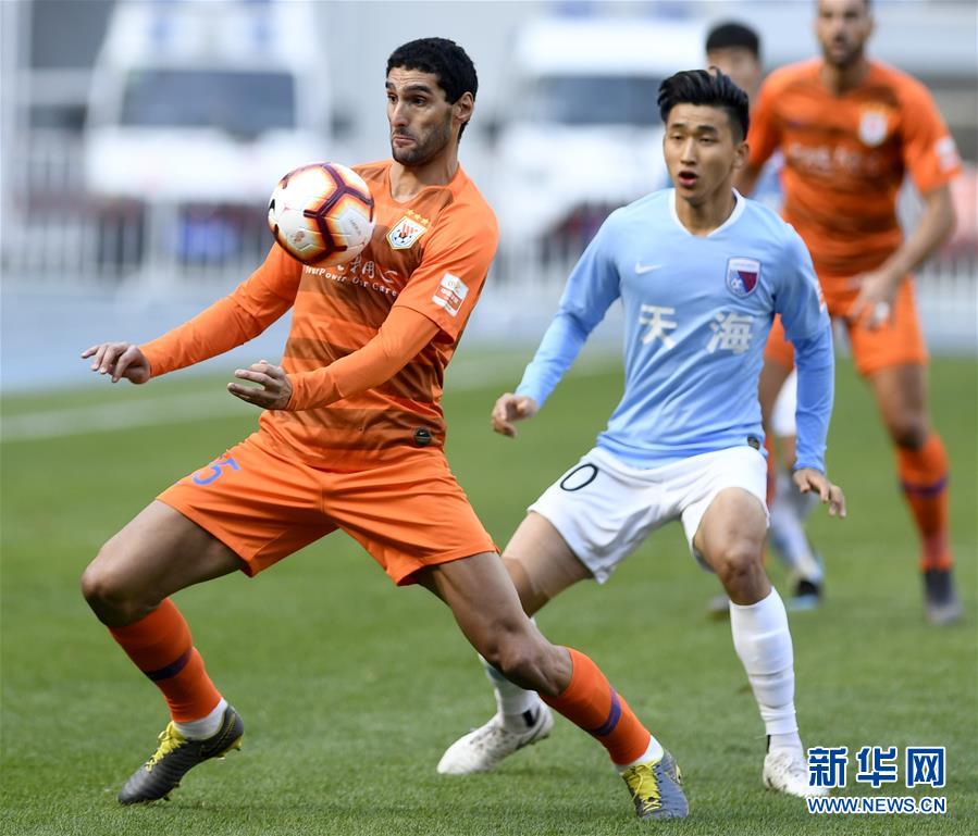 山东鲁能泰山队球员费莱尼(左)在比赛中拼抢。新华社记者岳月伟摄