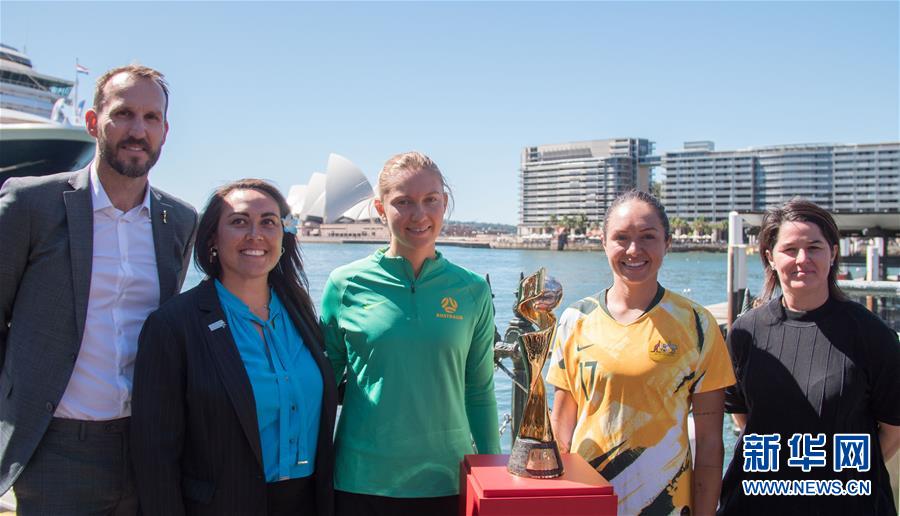澳大利亚男足球员马克·施瓦策尔(左一)与澳大利亚女足球员西蒙(右二)等在巡回展上与奖杯合影。新华社发(胡泾辰摄)