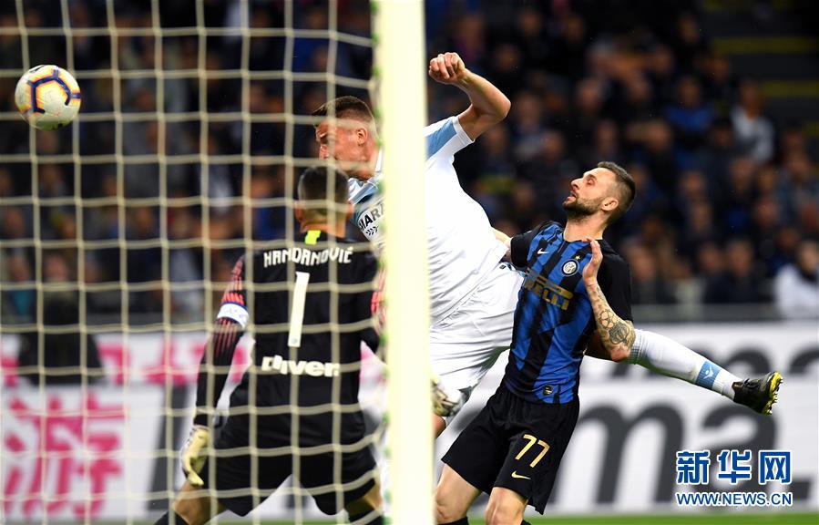拉齐奥队球员萨维奇(中)在比赛中头球攻门。 当日,在2018-2019赛季意大利足球甲级联赛第29轮比赛中,国际米兰队主场以0比1不敌拉齐奥队。 新华社发