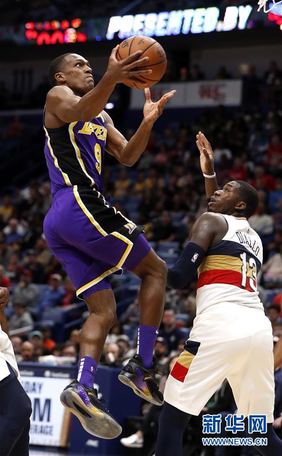 3月31日,湖人队球员隆多(左)在比赛中上篮。 当日,在2018-2019赛季NBA常规赛中,洛杉矶湖人队客场以130比102战胜新奥尔良鹈鹕队。 新华社/美联社