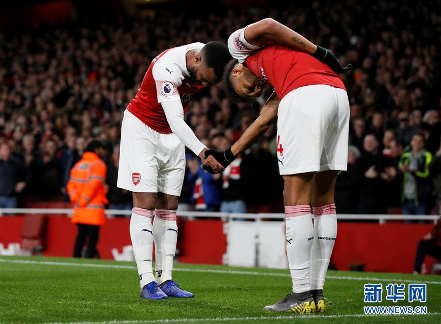 4月1日,阿森纳队球员拉卡泽特(左)与队友奥巴梅杨在比赛中庆祝进球。当日,在2018-2019赛季英超联赛第32轮比赛中,阿森纳队主场以2比0战胜纽卡斯尔联队。 新华社/路透社