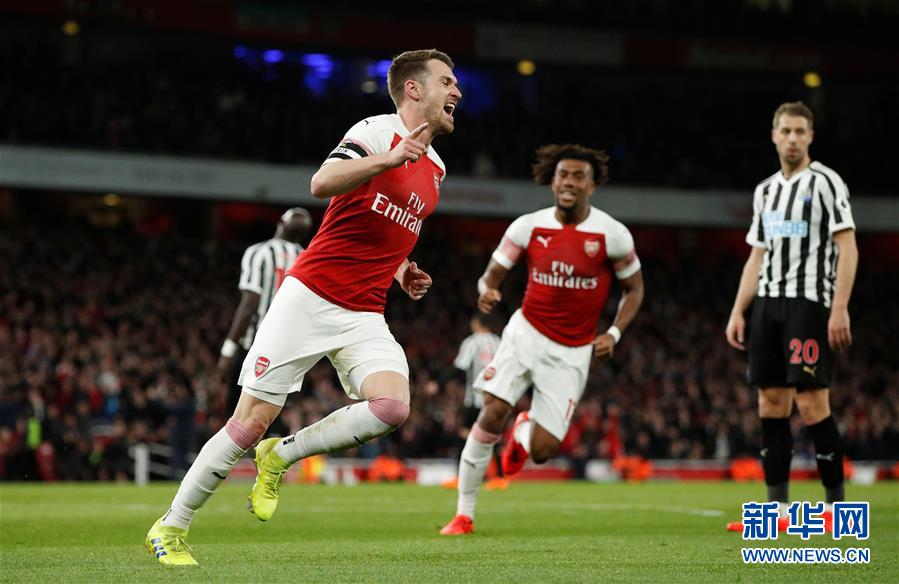 阿森纳队球员拉姆塞(前)在比赛中庆祝进球。新华社/路透社