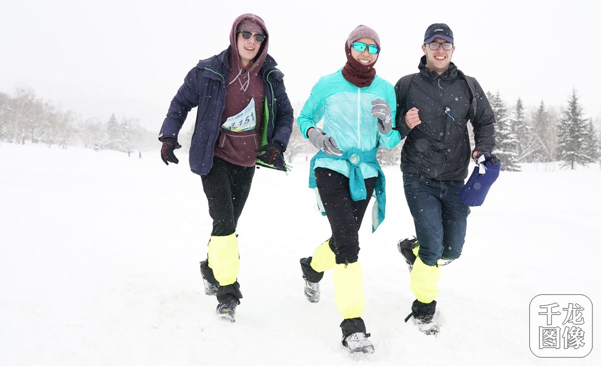 4月1日,长白山特色雪地马拉松向天跑活动鸣枪开跑。最终,来自瑞士的Jonas Thuerig(邓瑞翔)获得男子组冠军,成绩为54分38秒。赵宇涵和仲济喜分获男子组亚军和季军。女子组的冠亚季军分别是孙乐美、曾敏和宿诺,最好成绩为1小时8分41秒。图为参赛选手奔跑在林海雪原以“不言放弃”的精神先后冲过终点。千龙网发 首都媒体跑团萧峰摄