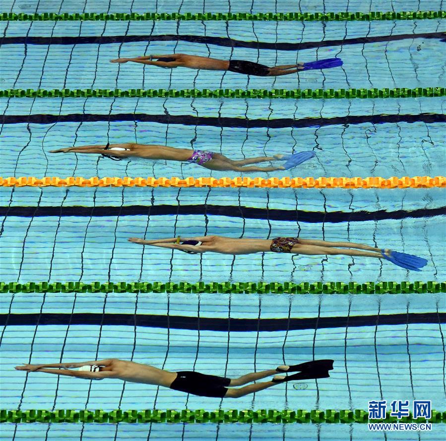 4月2日,选手们在男子青年组400米双蹼决赛中。 当日,2019年全国春季蹼泳锦标赛在福建省将乐县举行。 新华社记者彭张青摄