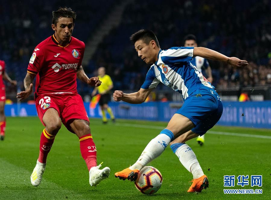 西班牙人队球员武磊(右)与赫塔菲队球员达米安·苏亚雷斯在比赛中拼抢。新华社发(胡安·戈萨摄)