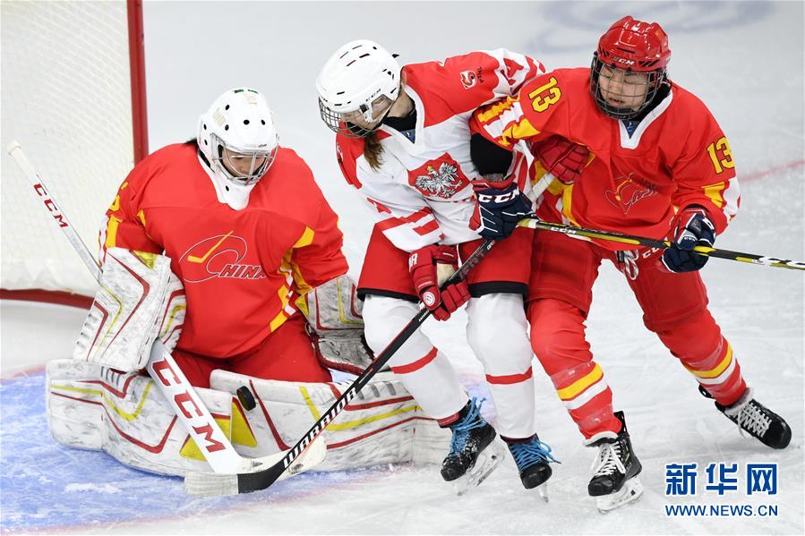 中国队球员王雨晴(左)和赵启男(右)在比赛中防守波兰队球员奥利维娅·汤姆乔克的进攻。新华社记者鞠焕宗摄