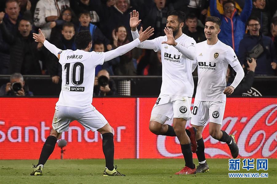 4月3日,巴伦西亚队球员加雷(中)在进球后和队友庆祝。 当日,在2018-2019赛季西甲联赛第30轮比赛中,皇家马德里队客场以1比2不敌巴伦西亚队。 新华社/法新社