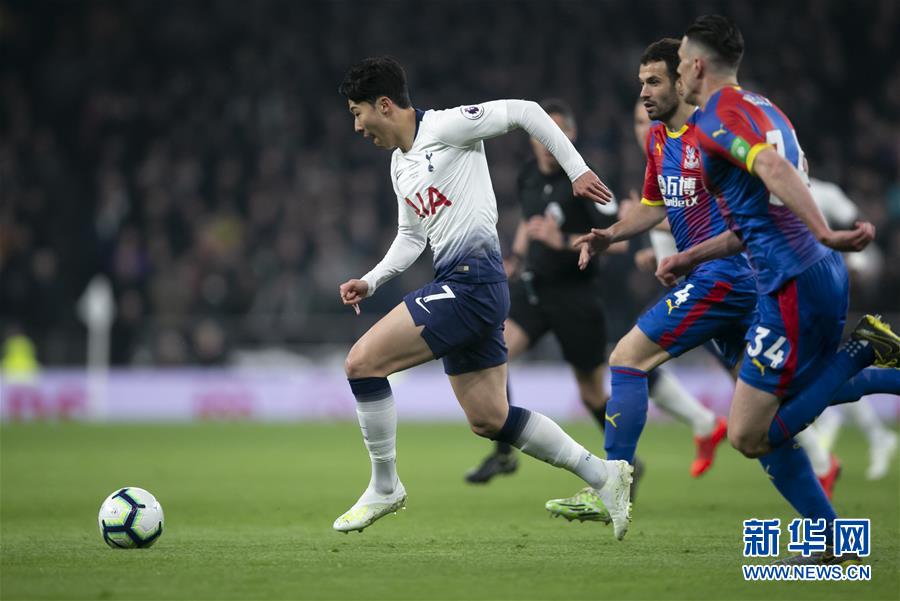 热刺队球员孙兴民(左一)在比赛中带球突破。新华社记者韩岩摄